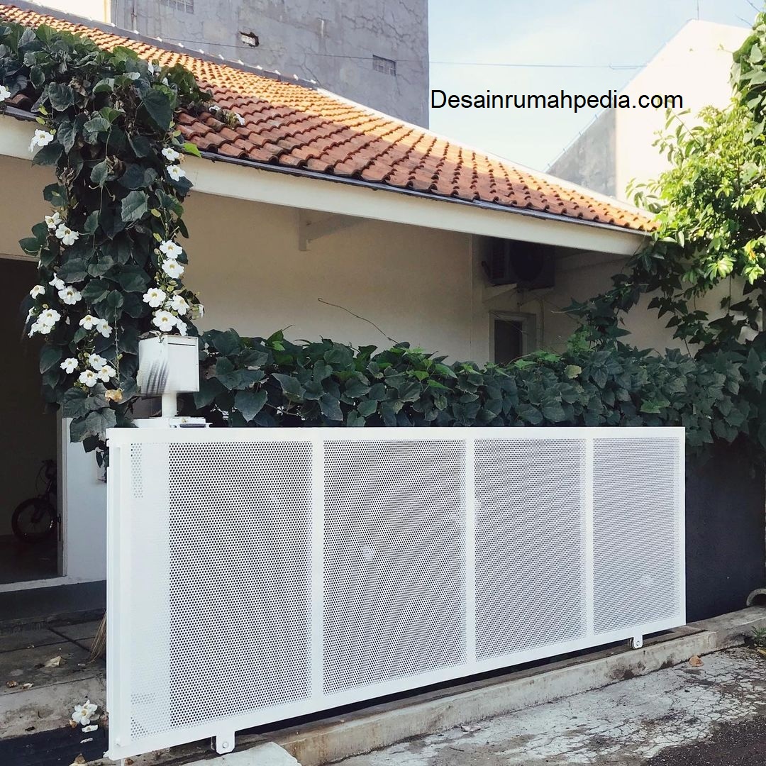 Inspirasi rumah modern identik dengan penggunaan warna putih yang mencerminkan kesan minimalis. Apalagi inspirasi pagar ini didesain elegan dengan model menyerupai jaring dengan material besi perforated yang kokoh. Warna putih dipilih agar terlihat selaras dengan konsep rumah ini yang didominasi warna putih juga. Tambahkan juga dekorasi berupa tanaman rambat thunbergia untuk menciptakan suasana asri pada hunian.