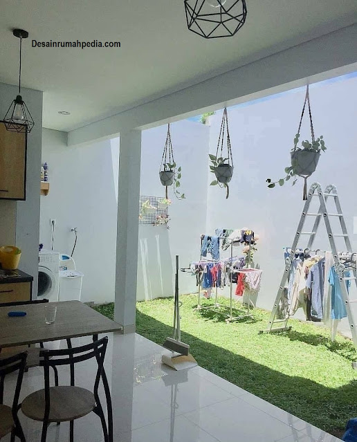 Selain area teras belakang digunakan untuk dapur dan ruang makan, anda dapat membuat halaman belakang diisi dengan taman atau area jemuran. Dengan laundry dan jemuran berada di halaman belakang, anda juga dapat membuat taman minimalis untuk memberikan suasana segar pada dapur. Anda dapat menyisakan lahan di halaman belakang ini untuk digunakan sebagai area santai seperti berjemur, tempat bermain anak, dan sebagainya.