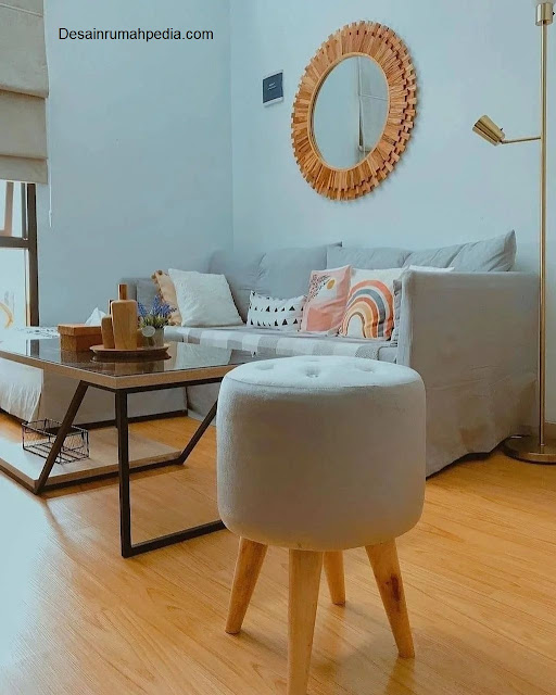 Dekorasi cermin adalah cara termudah untuk menciptakan ilusi ruangan sempit terasa luas. Anda bisa meniru desain ruang tamu seperti pada gambar.