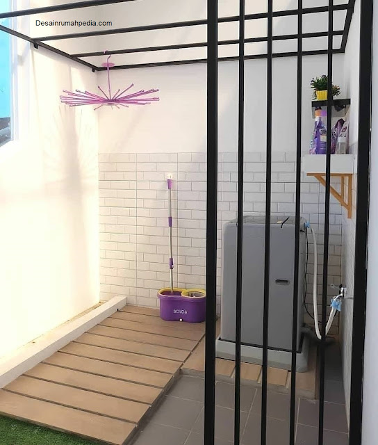 Desain ruang cuci dan jemur ini dirancang fungsional dengan penataan rapi. Terdapat gantungan fungsional yang muat untuk banyak jemuran.