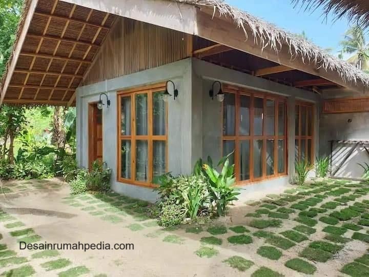 Tampilan pertama kita disambut dengan eksterior rumah bergaya unfinished ini. Sedikit unik dengan gaya tradisional menggunakan material semen ekspos dan juga kayu. Bahkan atapnya menggunakan tambahan dedaunan, sangat terasa etnik bukan! Uniknya lagi, rumah ini memiliki banyak bukaan, tentunya akan menjadikan suasana makin fresh terutama dengan lingkungan yang masih asri.